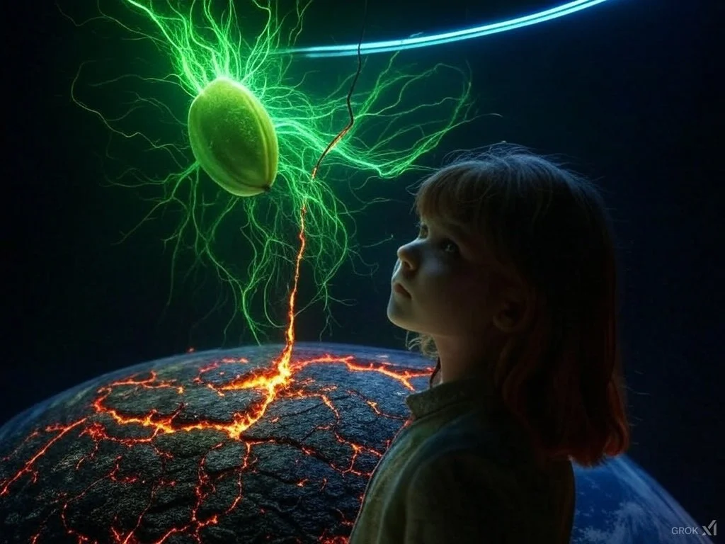 The sky above Earth blazed like a festering wound, its amber expanse torn open with jagged streaks of molten red and bruised purple, as if the planet's very veins had burst forth in a final, agonized protest. The air howled—a guttural, primal scream that vibrated through the ark's hull, carrying the acrid tang of burning sulfur that seeped past the seals, stinging young Lyra Kade's nostrils and making her eyes water. At seven years old, she pressed her small, trembling hands against the cold viewport, her breath fogging the reinforced glass in shallow, panicked bursts. Her auburn hair clung to her sweat-slick forehead in damp tangles, framing hazel eyes wide with terror, reflecting the chaos below: continents splitting like cracked clay under immense pressure, oceans boiling into hissing clouds of steam that rose like vengeful spirits, and the once-vibrant green heartbeat of forests and plains smothered beneath a thick shroud of ash and embers. The deck beneath her bare feet trembled with the groan of overtaxed engines, clawing desperately against gravity's weakening hold as the ark fought to escape the planet's death throes."Lyra, step back!" Her mother's voice cracked like brittle glass, laced with raw fear as she gripped Lyra's thin arm, pulling with a strength born of desperation. Alina Kade was a wiry woman in her mid-thirties, her once-golden hair now dulled to a lifeless straw by weeks of hiding in makeshift shelters, her green eyes wide with a terror she struggled to conceal behind a mask of maternal resolve. Her hands, rough and calloused from years tending the hydroponic farms in the Etherian colonies—where nutrient vats hummed under artificial lights and the scent of damp soil offered a fleeting reminder of Earth's lost bounty—shook uncontrollably as her nails dug into Lyra's soft skin. "You're too close—please, sweetheart!"But Lyra couldn't move, her small body rooted in place as her pulse thrummed in sync with a rhythm far older than her seven years—a deep, resonant hum that vibrated through her bones, rising from the fracturing core of Earth itself. It wasn't mere sound; it was a call, a mournful song woven into the planet's marrow, tugging at something buried deep inside her, something primal and untamed. Her fingers twitched involuntarily, and a faint shimmer bloomed across the viewport—a fragile forcefield flickering with unstable green light, like sunlight filtering through ancient leaves. It danced like a mirage on the glass's cold surface, its edges trembling, a reflex she didn't understand but couldn't suppress. The energy felt warm against her skin, a comforting pulse amid the horror, yet it carried an undercurrent of wildness that made her heart race.Alina stifled a gasp, her grip loosening as she stared at the shimmering veil, her face paling under the ark's harsh emergency lighting. "Not now, Lyra," she whispered, her voice breaking like waves against rock. "Not here. We can't let them see."Her father, Torin, stood rigid at the nearby console, his gaunt face bathed in the crimson glow of flashing emergency alerts that scrolled across holo-screens like accusatory sentences. His gray eyes—eyes Lyra had inherited, stormy and introspective—darted between the spitting coordinates and the viewport's apocalyptic view. His hands, scarred from years of manual labor in the colonies' harsh environments, trembled as he relayed urgent instructions to the Etherian pilots over the crackling comms, his voice a steady baritone fraying at the edges with exhaustion. "Adjust trajectory—north quadrant's collapsing faster than projected. We've got thirty seconds before the shockwave hits us."Torin was a Carrier like Lyra, though his gifts manifested subtler: telepathic nudges that had once guided farming crews through blinding dust storms, or faint premonitions that warned of failing equipment. He'd hidden them well, blending into the colonies' rhythm of daily survival, teaching Lyra to do the same during quiet evenings in their hab-unit, where the dim glow of solar lamps cast long shadows and he whispered tales of Earth's lost energy—stories of ancient forests that pulsed with green life, guardians against the void. Alina, unpowered but fiercely practical, had been his anchor, her unwavering love binding their small family against the encroaching shadow of NexCorp, the mega-corporation whose towering drills had begun piercing Earth's crust years ago, extracting resources with ruthless efficiency. Together, they'd dreamed of a quiet life amid the hydroponics, harvesting synthetic crops under artificial skies—until the drills grew louder, the towers rose higher, and the ground beneath their feet began to bleed molten rock."Stay with us, kiddo," Torin said, dropping to one knee beside Lyra, his voice a lifeline cutting through the chaos. He brushed a tangle of hair from her face, his calloused thumb lingering on her cheek, rough yet gentle. His gray eyes were hollow with defeat, shadowed by the weight of impossible choices, yet they burned with a desperate, flickering hope. "We're heading to the ring. We'll start over—new fields, new skies. You'll see stars that don't burn like this."Lyra nodded numbly, but the lie hung heavy between them, thick as the ash choking the atmosphere outside. Start over where? The ark jolted violently again, a bone-rattling lurch that sent alarms blaring, as NexCorp's sleek drones strafed its hull, their crimson beams slicing through the fleeing fleet like knives through fragile parchment. Screams ricocheted down the cramped corridors—shrill, panicked cries from families packed into the hold below, their voices drowning in the roar of fracturing metal and the thunderous booms of impacts. Beyond the viewport, Earth's crust buckled catastrophically, a massive canyon ripping open across the western continent, swallowing entire cities in a cascade of molten rock and billowing dust clouds that tasted bitter even through the ark's filters